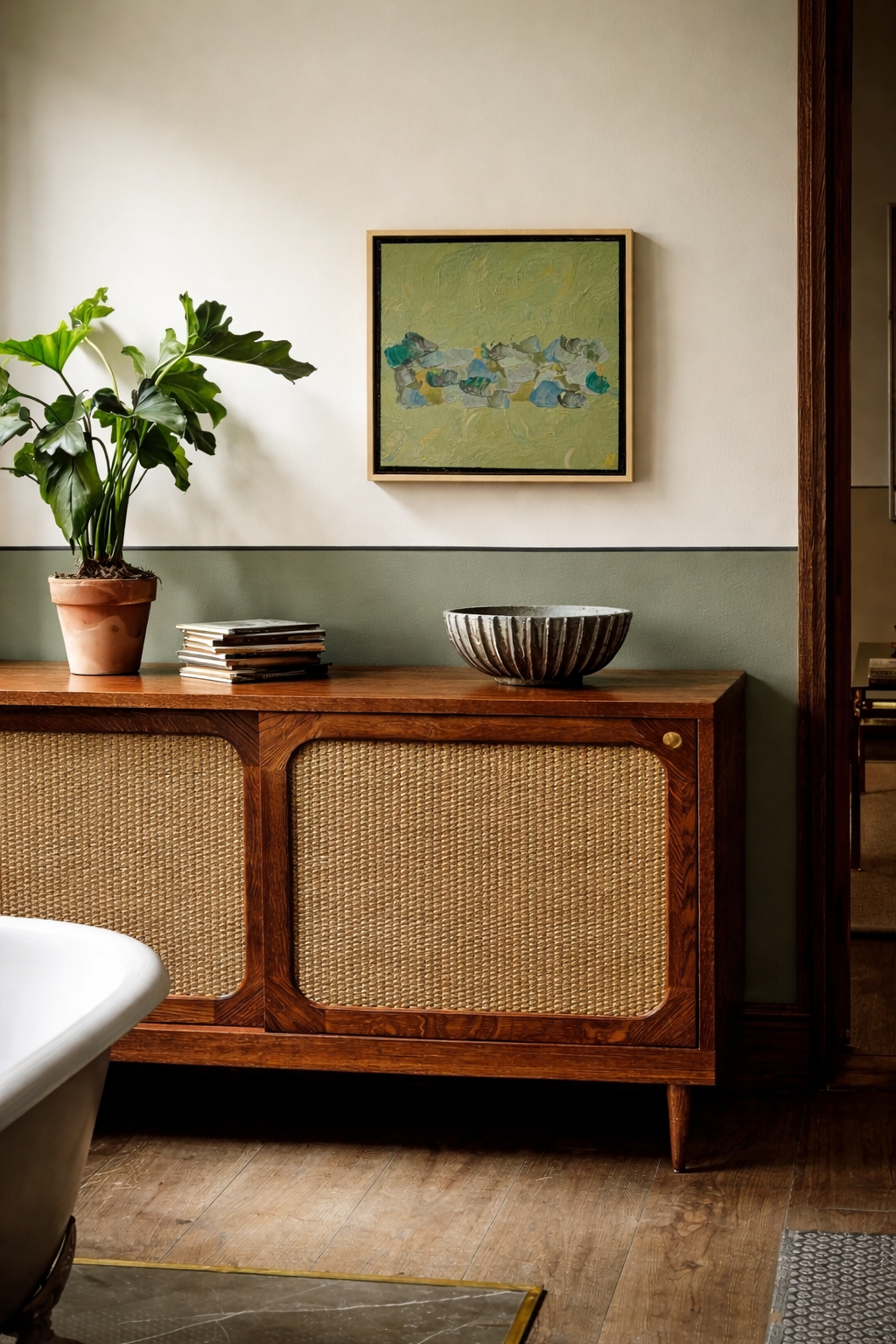 De compositie is opgebouwd uit krachtige, losse penseelstreken in verschillende groentinten, verrijkt met accenten van blauw, okergeel en diep smaragd. Dit palet suggereert de bladeren in het zonlicht. Het kleurgebruik is rijk en harmonieus, met subtiele diepte door het spel van licht en schaduw in de verflagen.