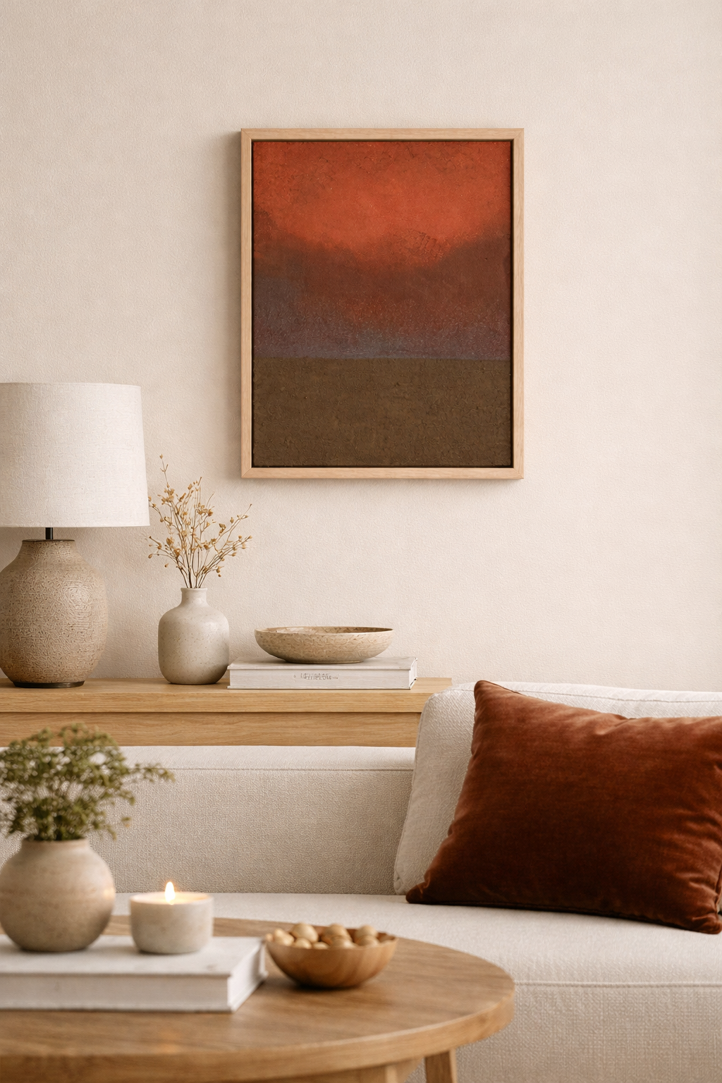 Het kunstwerk heeft een ingetogen, warme sfeer met diepe aardetinten en een subtiel verloop naar rood aan de bovenkant. Een beeld van een zonsopkomst over een stil, natuurlijk landschap in de vroegste vroegte van de ochtend. Waar enkel de stilte heerst en de wereld in vuur en vlam lijkt te staan. Alsof de wereld zich in de eerste rust van de dag zichzelf opwarmt voor de drukte van de dag.